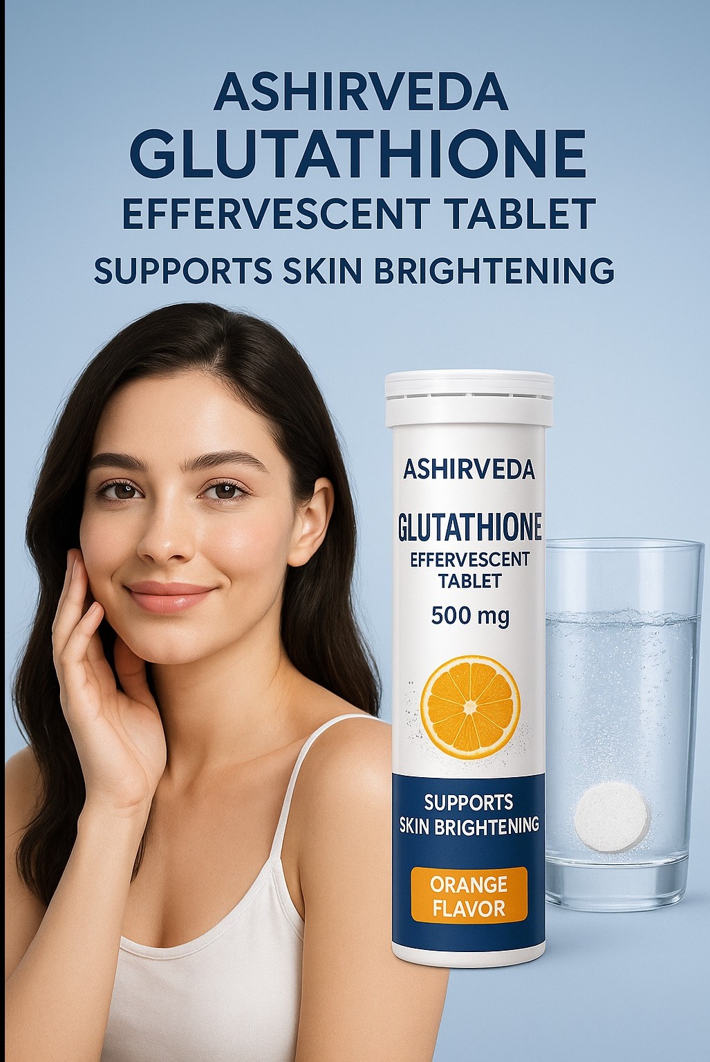 Learn how Ashirveda Glutathione Effervescent Tablets 500 mg will help you achieve glowing, balanced skin every day. These fizzy pills, which are enhanced with the potent antioxidant glutathione and a delightful orange smell, are simple and pleasurable to take because they melt rapidly in water. created specifically to help lighten skin, lessen dullness, and encourage a healthy glow from the inside out. Ideal for anyone looking for a quick and easy method to improve the hydration, vitality, and health of their skin. With Ashirveda's superior complement, feed your skin and savor the sparkling freshness.