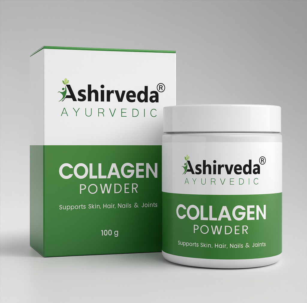 Ashirveda Ayurvedic Collagen Powder is a pure herbal collagen-boosting blend designed to enhance natural beauty and improve overall wellness. This advanced Ayurvedic formula supports skin tightening, anti-ageing, hair growth, nail strength, bone health, and joint flexibility.