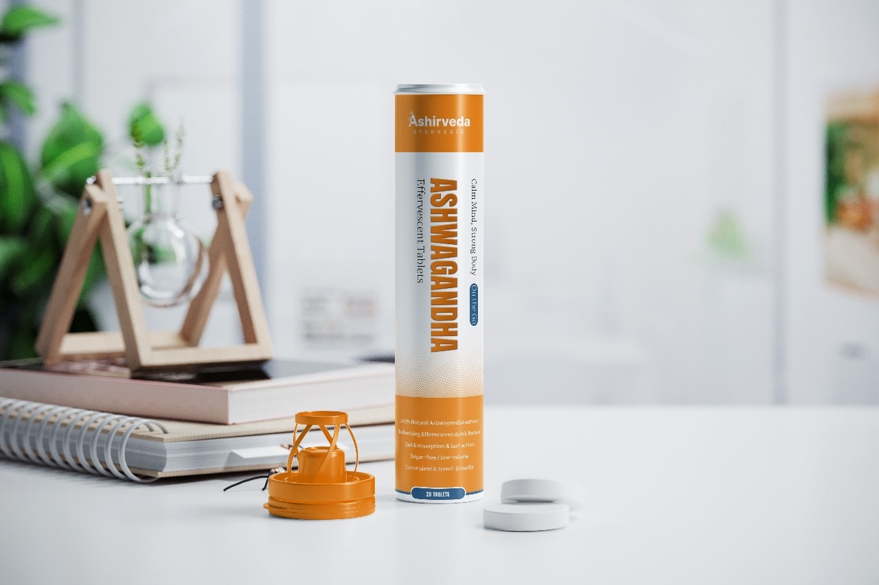 Ashirveda Ayurvedic Ashwagandha Effervescent Tablets are a natural stress-relief and energy-boosting solution designed for today’s fast-paced lifestyle. Enriched with the power of pure Ashwagandha extract, these effervescent tablets help reduce stress, anxiety, and fatigue while supporting mental clarity, stamina, and overall immunity. The effervescent formula ensures quick absorption, refreshing taste, and convenience—just drop, fizz, and sip for instant wellness. Ideal for professionals, students, and fitness enthusiasts, Ashirveda’s Ashwagandha tablets balance mind and body naturally. Experience the perfect blend of Ayurveda and modern innovation to stay calm, focused, and energized every day.